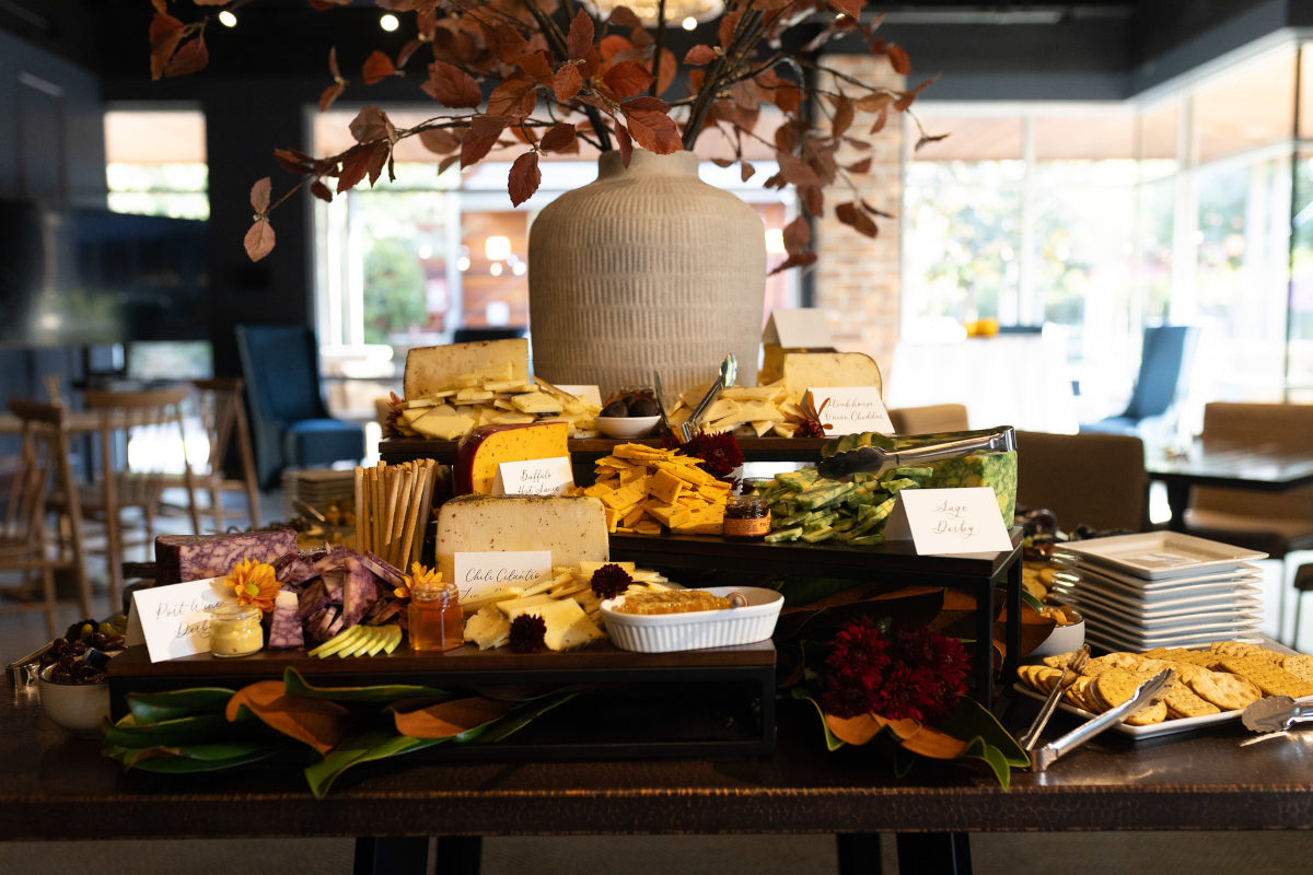 Selection of locally sourced cheeses paired with dried fruit and artisan crackers